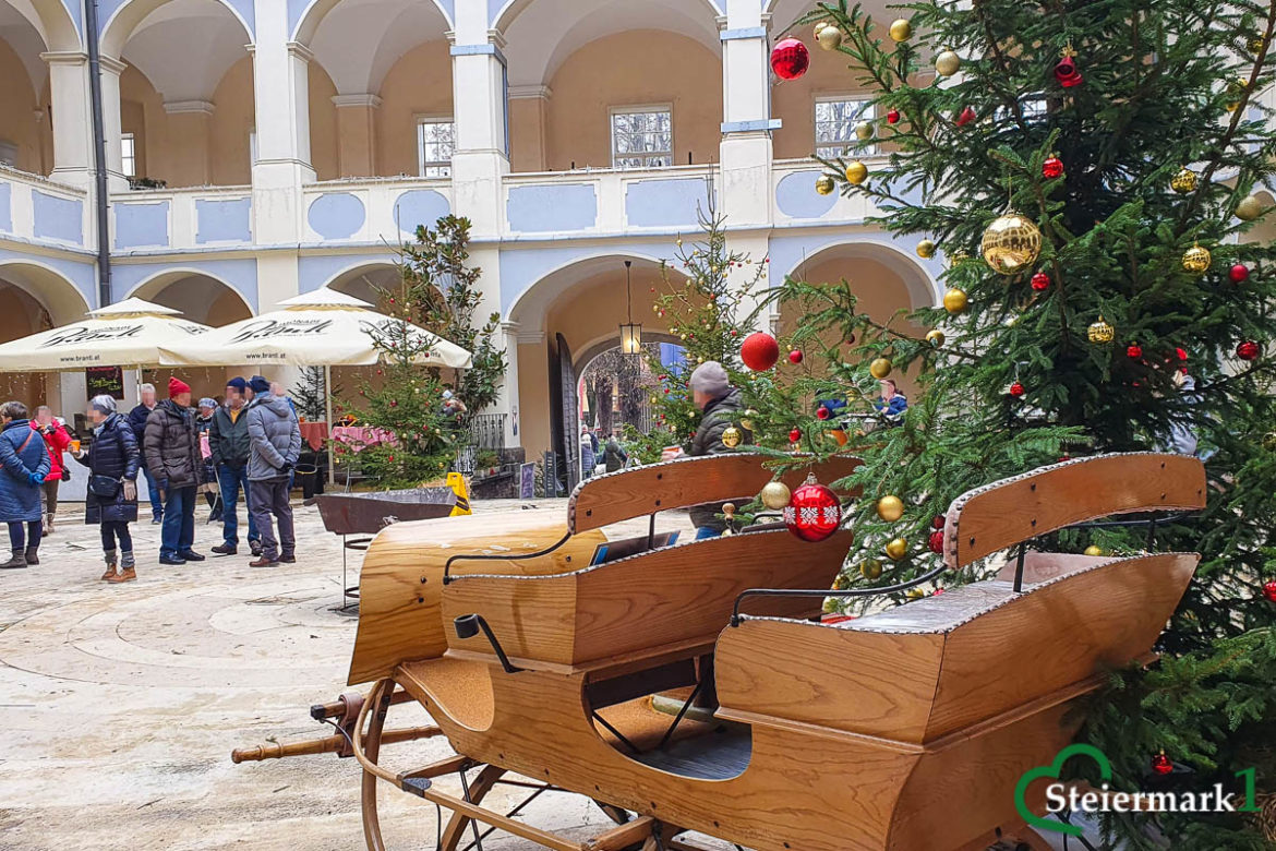 Der Innenhof von Schloss Piber wird von 8. bis 11. Dezember und von 16. bis 18. Dezember zu einer kleinen, idyllischen Weihnachtswelt. Wenn man durch das große Tor in den Arkadenhof eintritt, ist es beinahe so, als würde man eine andere Welt betreten. Der stimmungsvoll beleuchtete Innenhof strahlt etwas Besonderes aus.