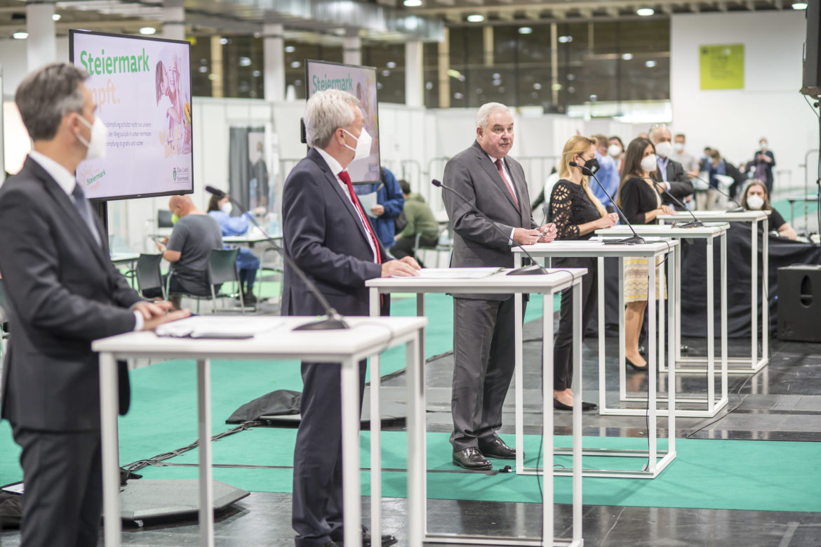 In der Messehalle in Graz gab die steirische Landesspitze mit Landeshauptmann Hermann Schützenhöfer, Landeshauptmann-Stellvertreter Anton Lang, Gesundheitslandesrätin Juliane Bogner-Strauß und Soziallandesrätin Doris Kampus sowie der Grazer Bürgermeister Siegfried Nagl am Nachmittag des 12. Mai einen Ausblick auf die Zeit nach den Öffnungen ab der kommenden Woche.