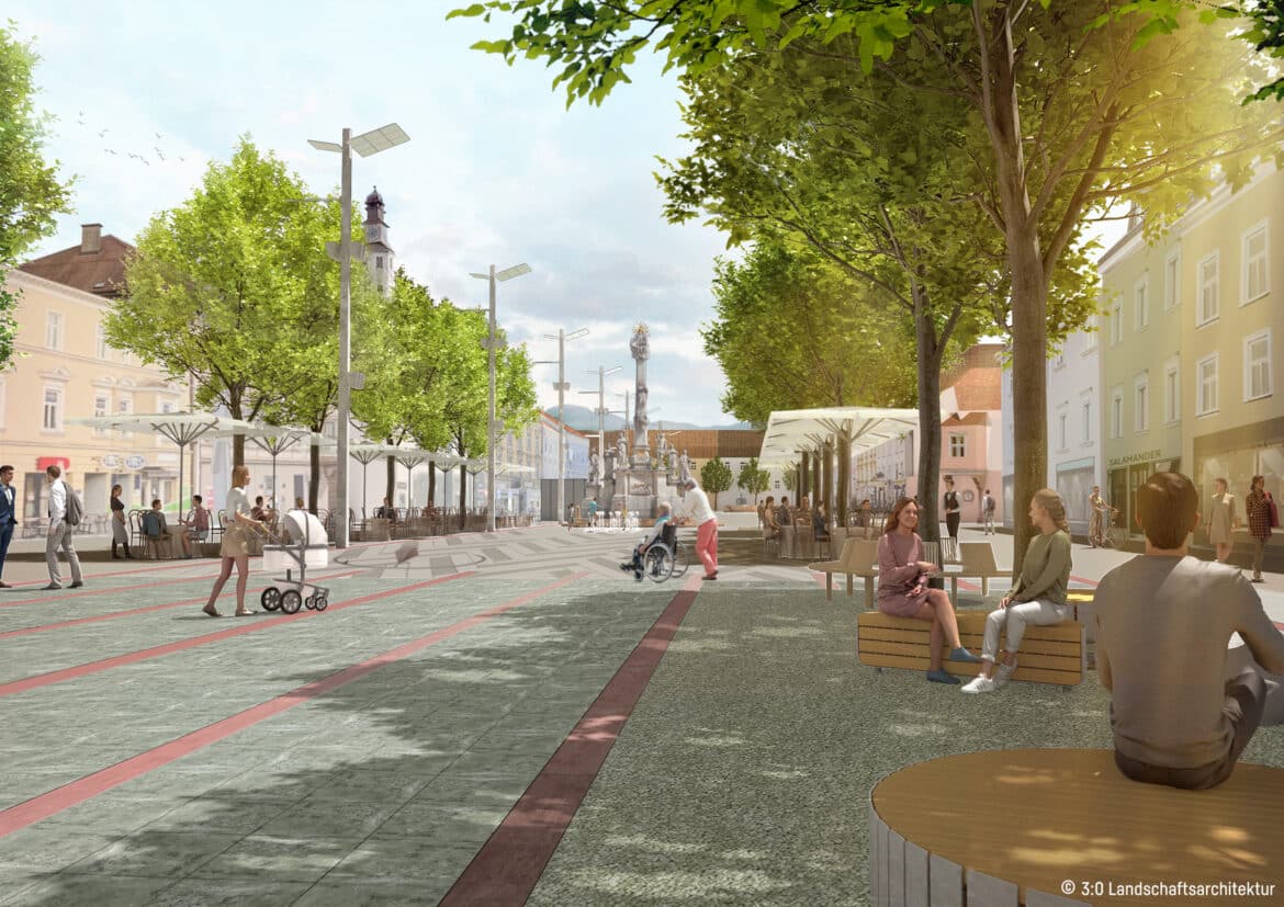 „Der Leobener Hauptplatz wappnet sich für die Zukunft und wird zum grünen Herzen der Innenstadt“, so die Vertreter:innen von 3:0 Landschaftsarchitektur.
